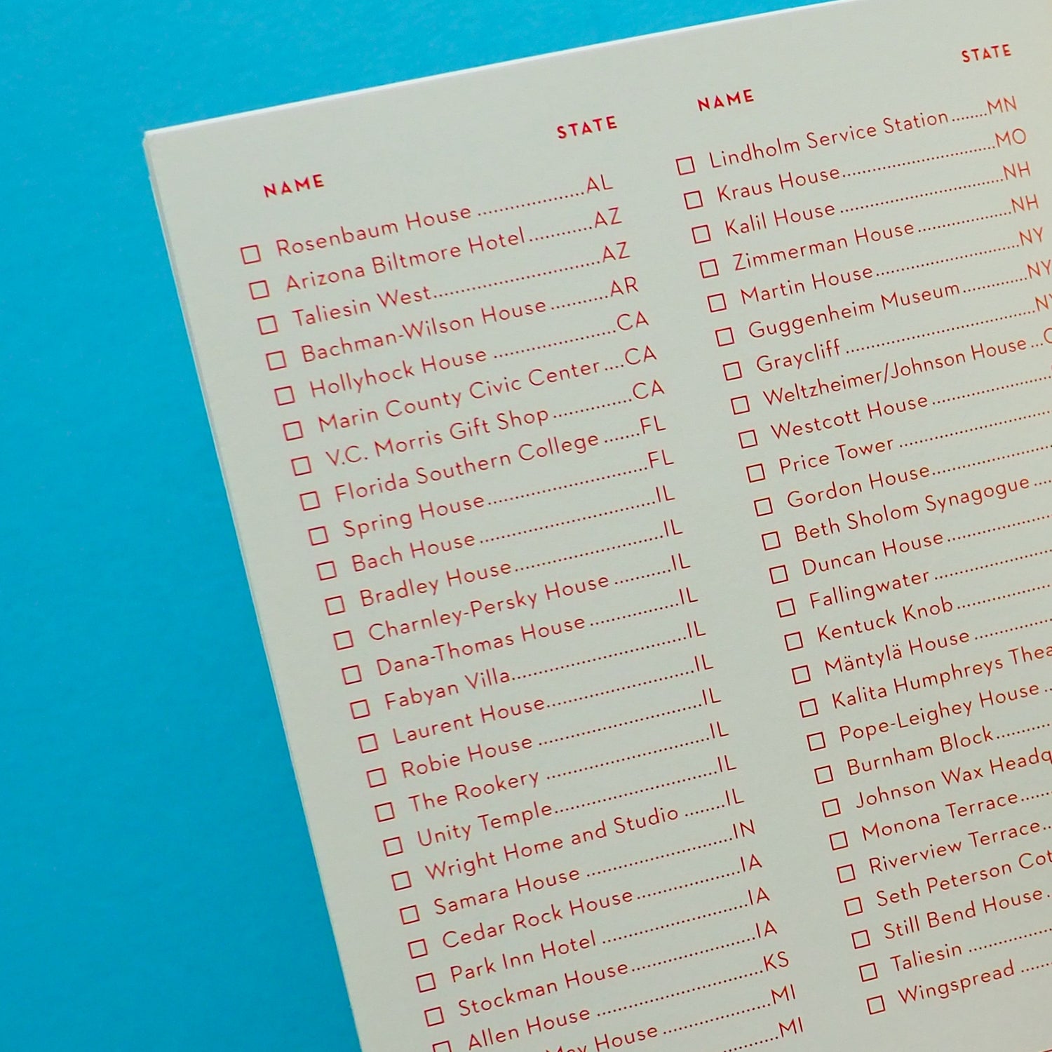 Wright Passport is a pocket notebook designed for tracking and planning visits to Frank Lloyd Wright sites. Log visits to his iconic buildings and create a personal keepsake full of architectural inspiration.